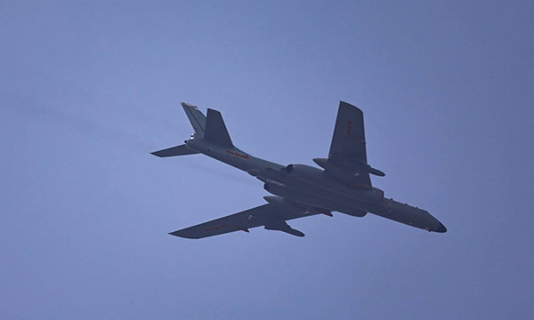FILE PHOTO: A H-6K bomber flies over Tiananmen Square during a military parade to mark the 80th anniversary of the end of World War Two, in Beijing, China, September 3, 2025. REUTERS/Tingshu Wang/File Photo